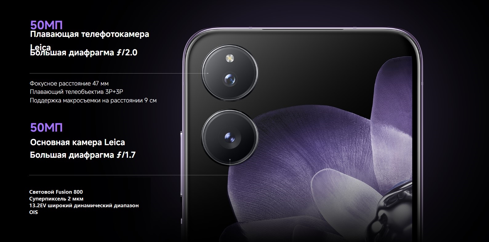 | Особенности тыловой камеры | оптика Leica Summilux+W26:W38, 75-мм плавающий телеобъектив |